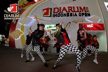 Para dancer berpose bersama usai tampil menghibur pengunjung Djarum Indonesia Open Super Series 2013.