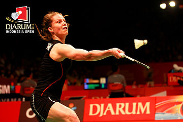 Juliane Schenk (Jerman) mengembalikan shuttlecock ke arah Tai Tzu Ying (China Taipei).