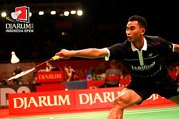Tommy Sugiarto (Indonesia) mengembalikan shuttlecock ke arah R.M.V. Gurusaidutt (India).