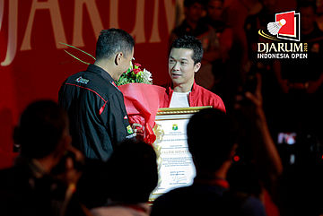 Taufik Hidayat mendapatkan penghargaan dari publik bulutangkis Indonesia dalam acara perpisahannya sebagai atlet bulutangkis profesional di Istora Senayan.