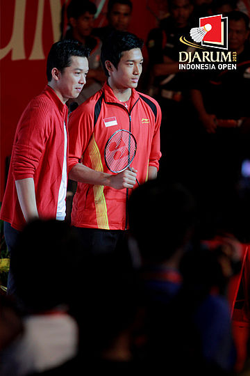 Ko Sung Hyun/Lee Yong Dae (Korea Selatan) menyambar pengembalian tanggung dari Mohammad Ahsan/Hendra Setiawan (Indonesia).