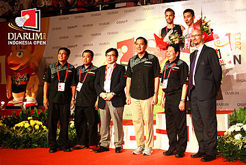 Marc Zwiebler dan Lee Chong Wei (atas) berfoto bersama Ketua Umum PB PBSI, perwakilan Djarum, OSIM, BWF dan lain-lain di podium juara.