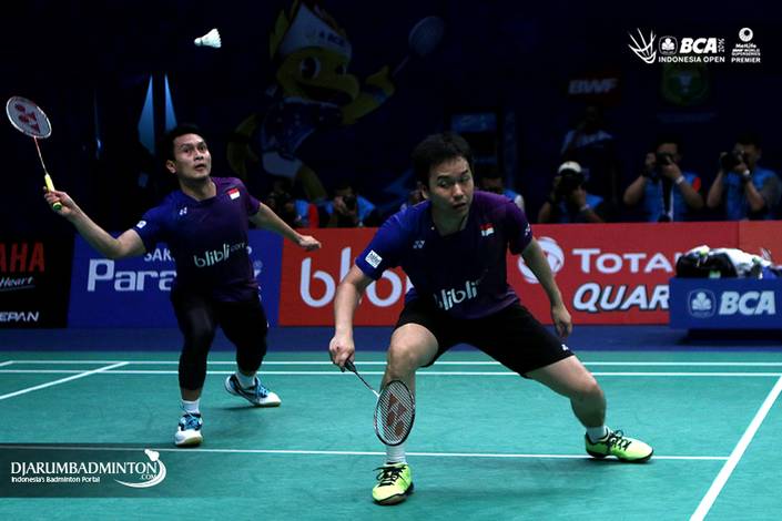 Three seeded pairs were stopped at the last 16 of the tournament. Greysia Polii/Nitya Krishinda Maheswari were stunned by Vivian Kah Mun Hoo/Woon Khe Wei (Malaysia) in a two set match, 17-21, 19-21. Tontowi Ahmad/Liliyana Natsir surprisingly were stopped by a newly paired Danish, Kim Astrup/Line Kjaersfeldt, 19-21, 17-21. Hendra/Ahsan also couldn't replicate their success at Thomas Cup final before finally stopped by Mads Conrad Petersen/Mads Pieler Kolding (Denmark) with 21-19, 13-21, 18-21.