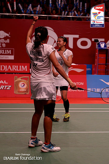 Nitya Krishinda M/Greysia Polii (INA) menahan serangan lawan