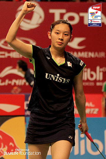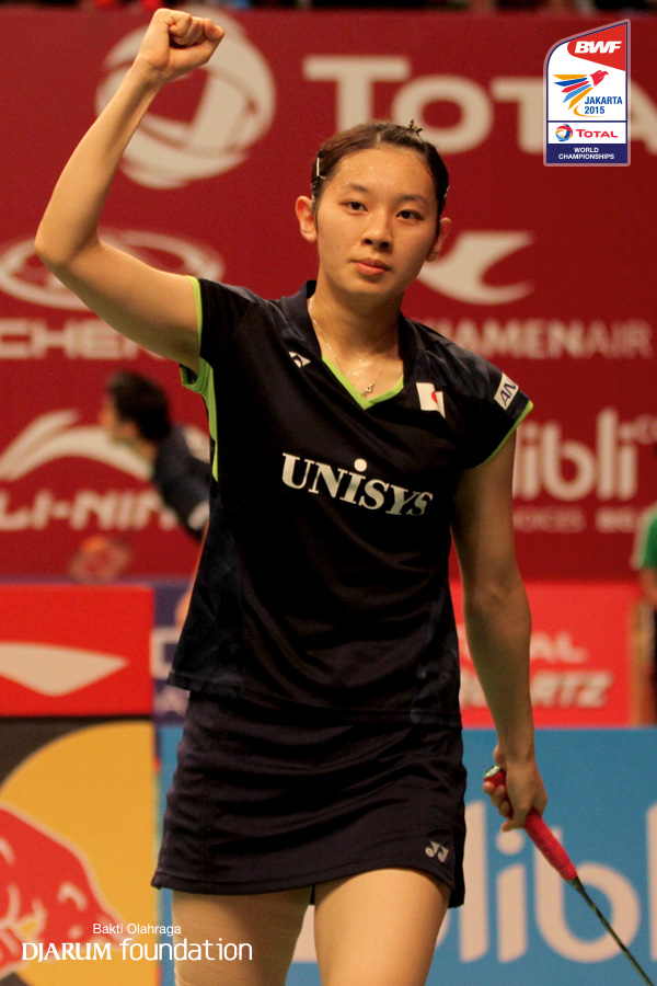 Ekspresi Sayaka Takahashi (JPN) ketika mendapatkan poin