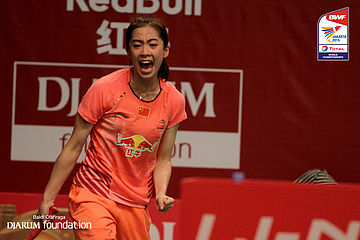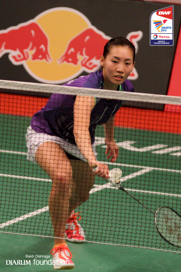 Ekspresi Wang Shixian (CHN) ketika mendapatkan poin