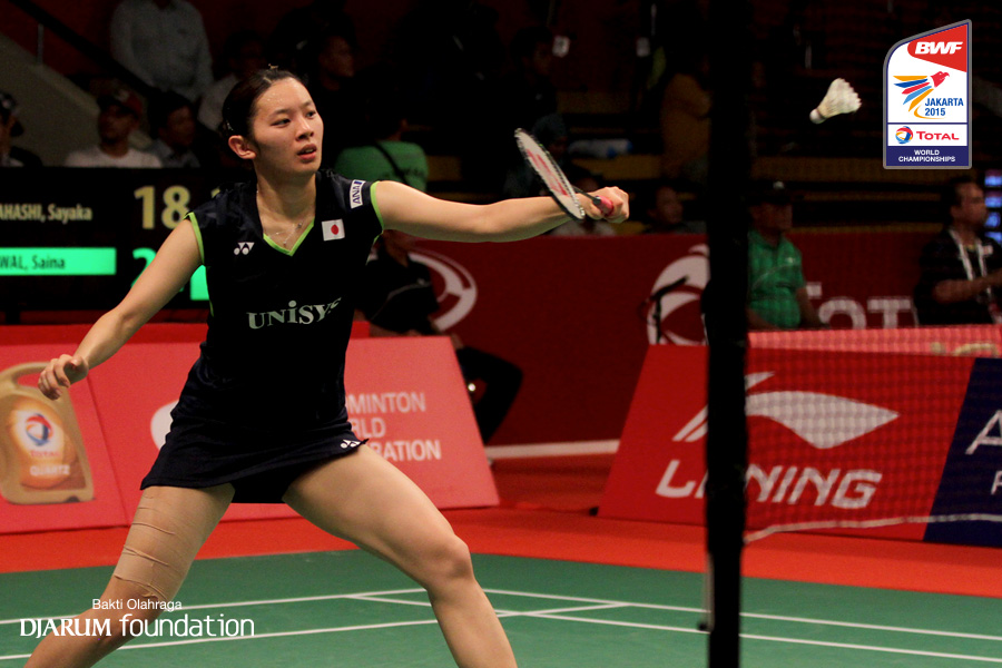 Sayaka Takahashi (JPN) mengembalikan shuttlecock ke arah lawan