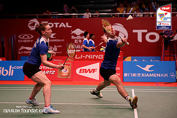Sam Magee/Chloe Magee (IRL) mengembalikan shuttlecock ke arah lawan