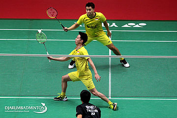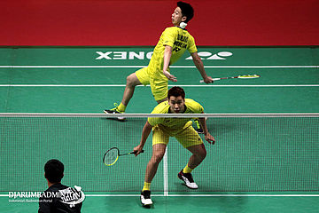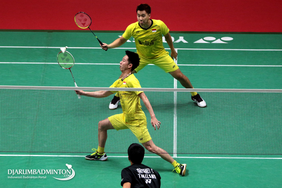Kevin Sanjaya Sukamuljo/Marcus Fernaldi Gideon (Indonesia) Mengembalikan Shuttlecock