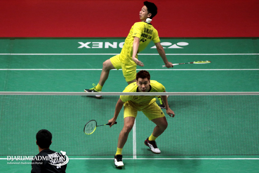 Kevin Sanjaya Sukamuljo/Marcus Fernaldi Gideon (Indonesia) Menghadang Serangan