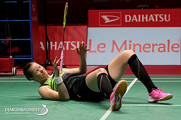 Christinna Pedersen (Denmark) Terjatuh Saat Berusaha Menghadang Serangan