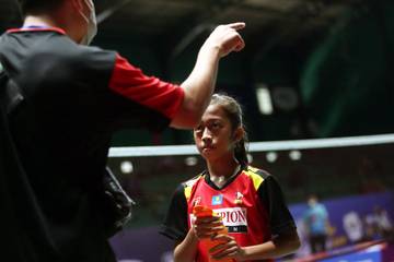 Tunggal putri U-11 Orizae Ganesha Jovi (Champion Klaten) dan pelatih saat interval gim