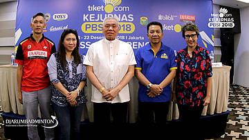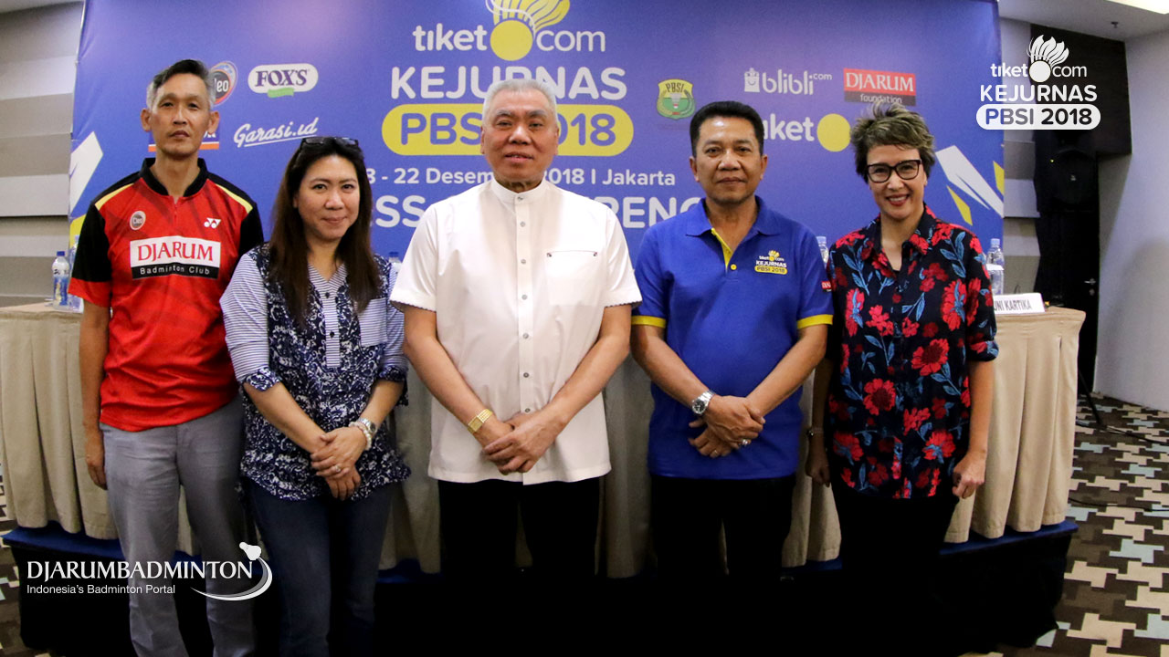 (Ki-Ka) Fung Permadi, Susy Susanti, Alex Tirta, Achmad Budiharto, Yuni Kartika menjadi narasumber pada konferensi pers Tiket.com Kejurnas PBSI 2018.