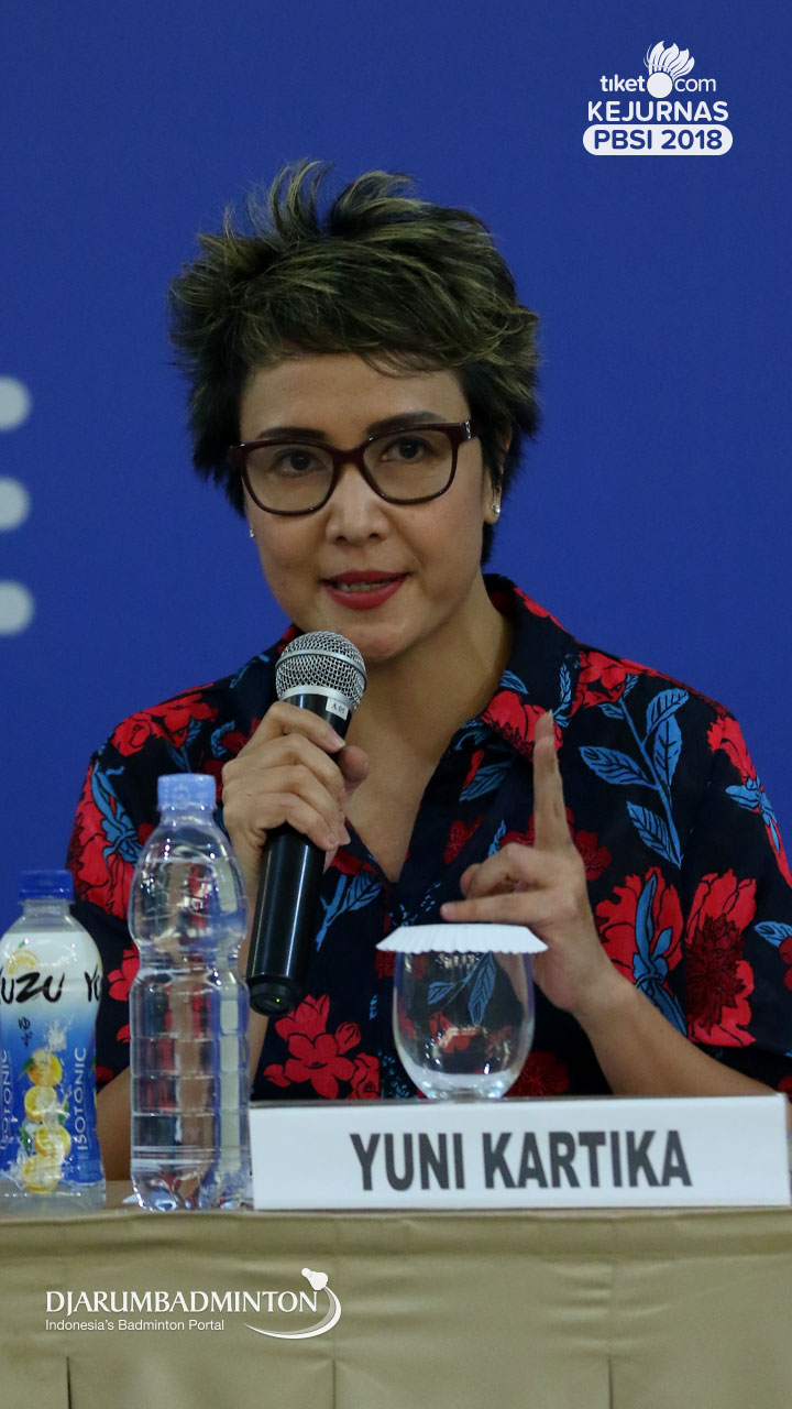 Yuni Kartika menjadi pembawa acara pada konferensi pers Tiket.com Kejurnas PBSI 2018.
