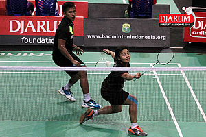 MAKASSAR - Laju pasangan ganda campuran wakil PB Jaya Raya Jakarta, Rian Swastedian/Apriani Rahayu di ajang Djarum Sirkuit Nasional (Djarum Sirnas) Li...