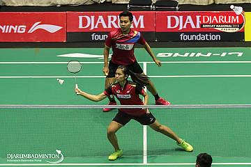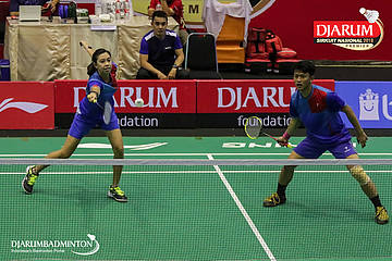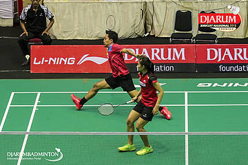 M. Robby Darwis dan Rahmadhani Hastiyanti Putri (Sangkuriang Graha Sarana PLN Bandung+PB Djarum, Kudus) berusaha mengembalikan shuttlecock