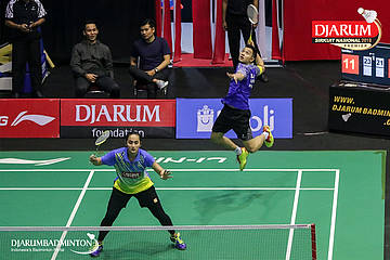 Amri Syahnawi dan Shela Devi Aulia (Jaya Raya Jakarta, Jakpus) berusaha membalikan shuttlecock