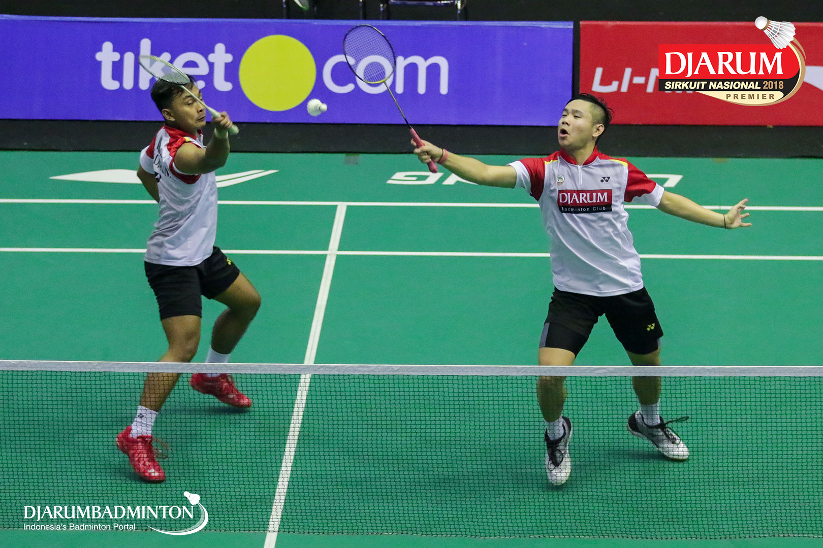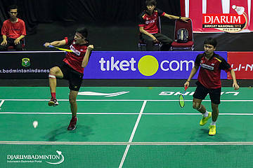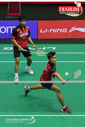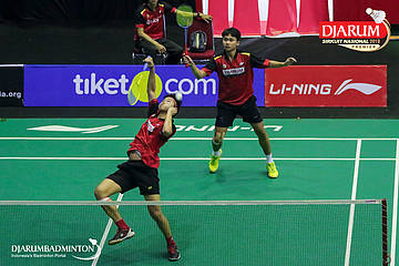 Naufal Ligo Saufik dan Yoggi Pamungkas (PB Djarum, Kudus) mengem balikan shuttlecock