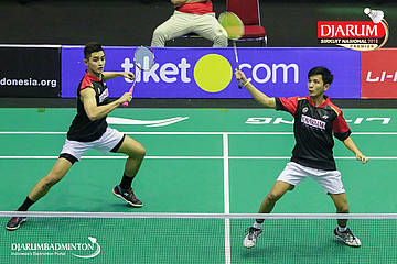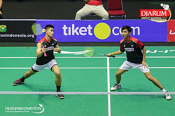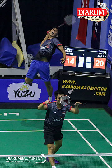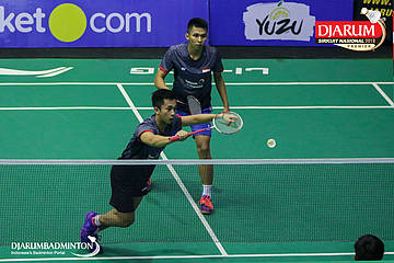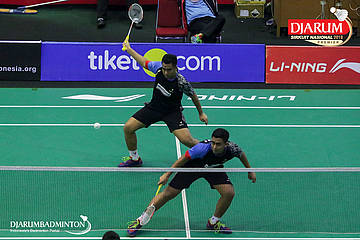 M. Lucky Andres Apriyanda dan Respati Banuaji (PB Djarum, Kudus) berusaha menyambut serangan