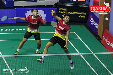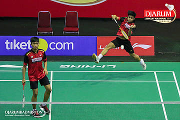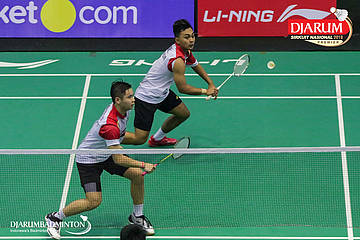 M. Lucky Andres Apriyanda dan Respati Banuaji (PB Djarum, Kudus) berusaha mengembalikan shuttlecock