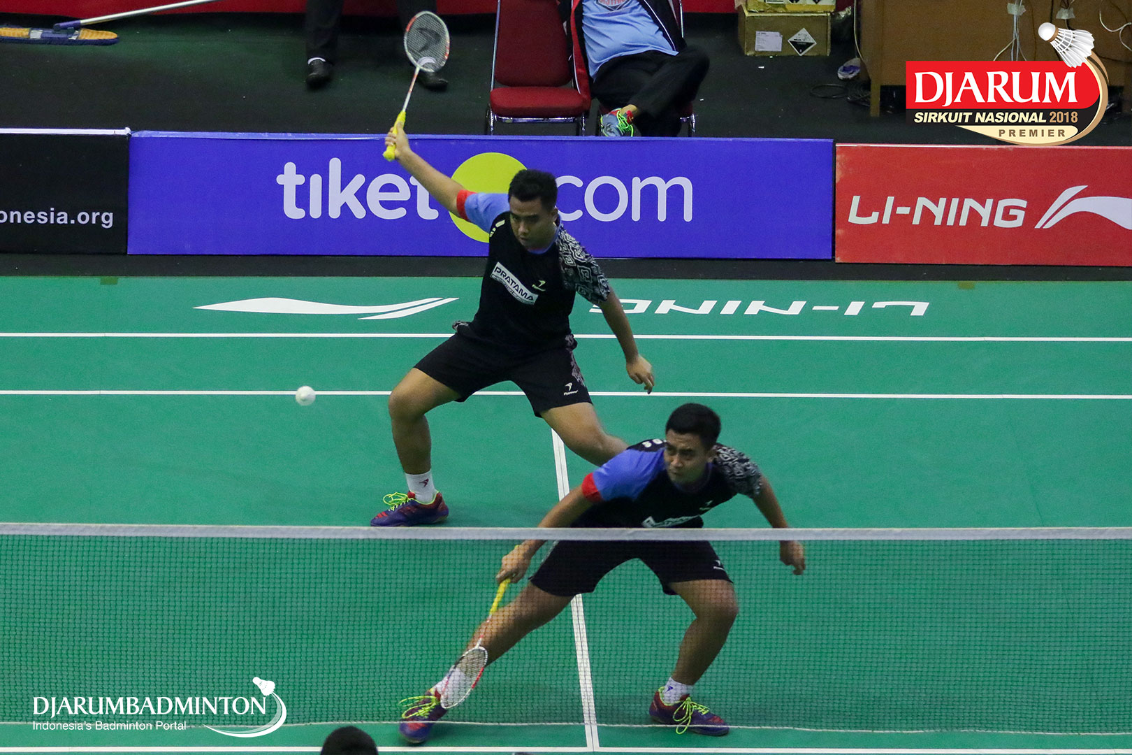 Habib Alfariz dan Rizal Muhammad Sofyan (Pusdiklat Telkom) bersiap menyambut shuttlecock