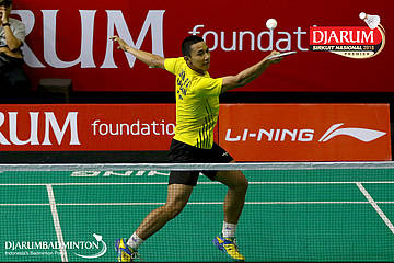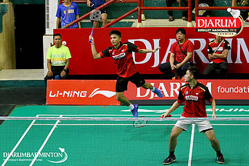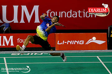 M. Lucky Andres Apriyanda/Respati Banuaji (PB Djarum, Kudus) bersiap menyambar pengembalian