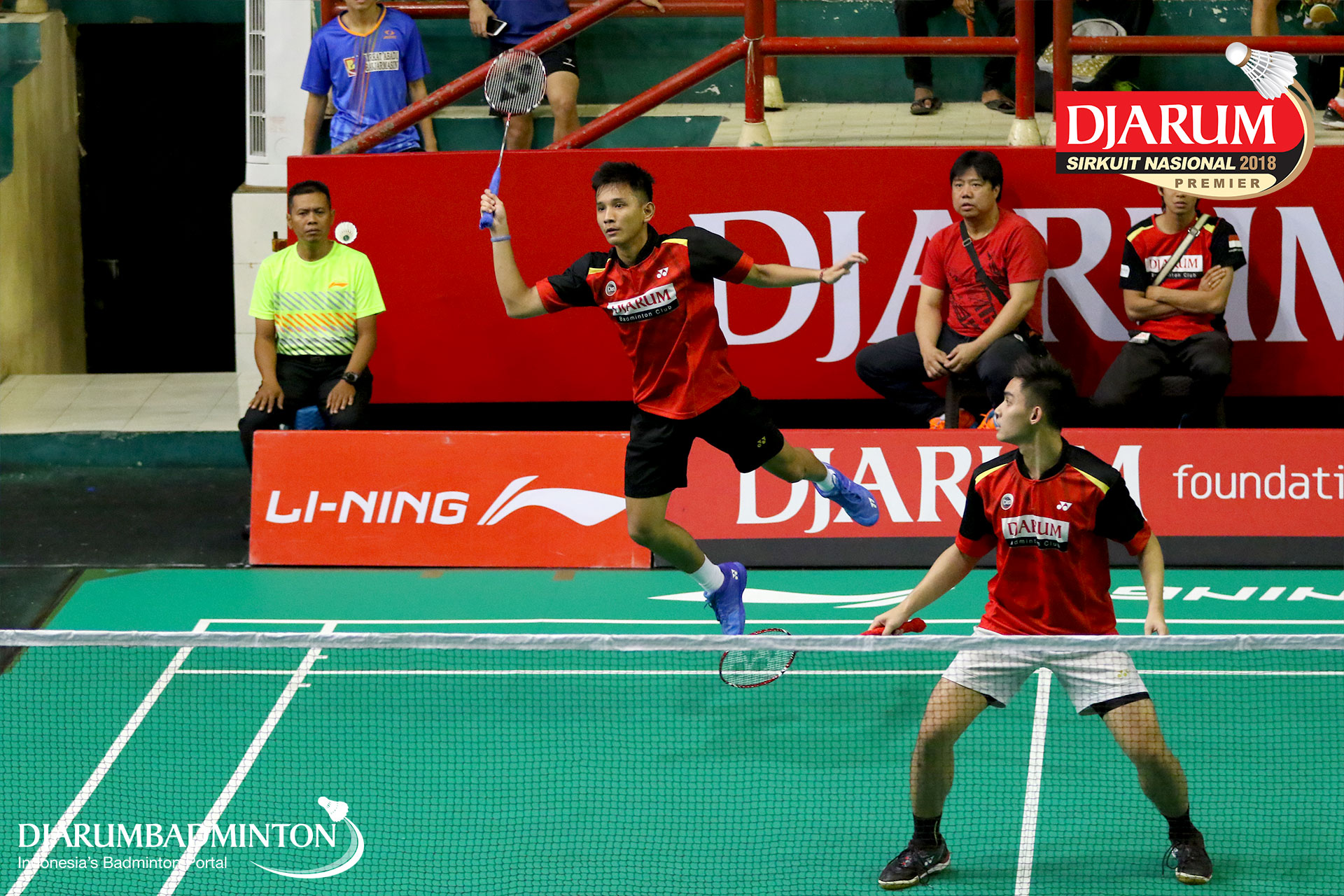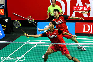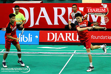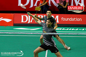 Bobby Setiabudi/Muhammad Aldo Apriyandi (PB Djarum, Kudus) mengembalikan shuttlecock