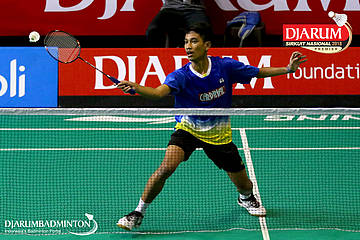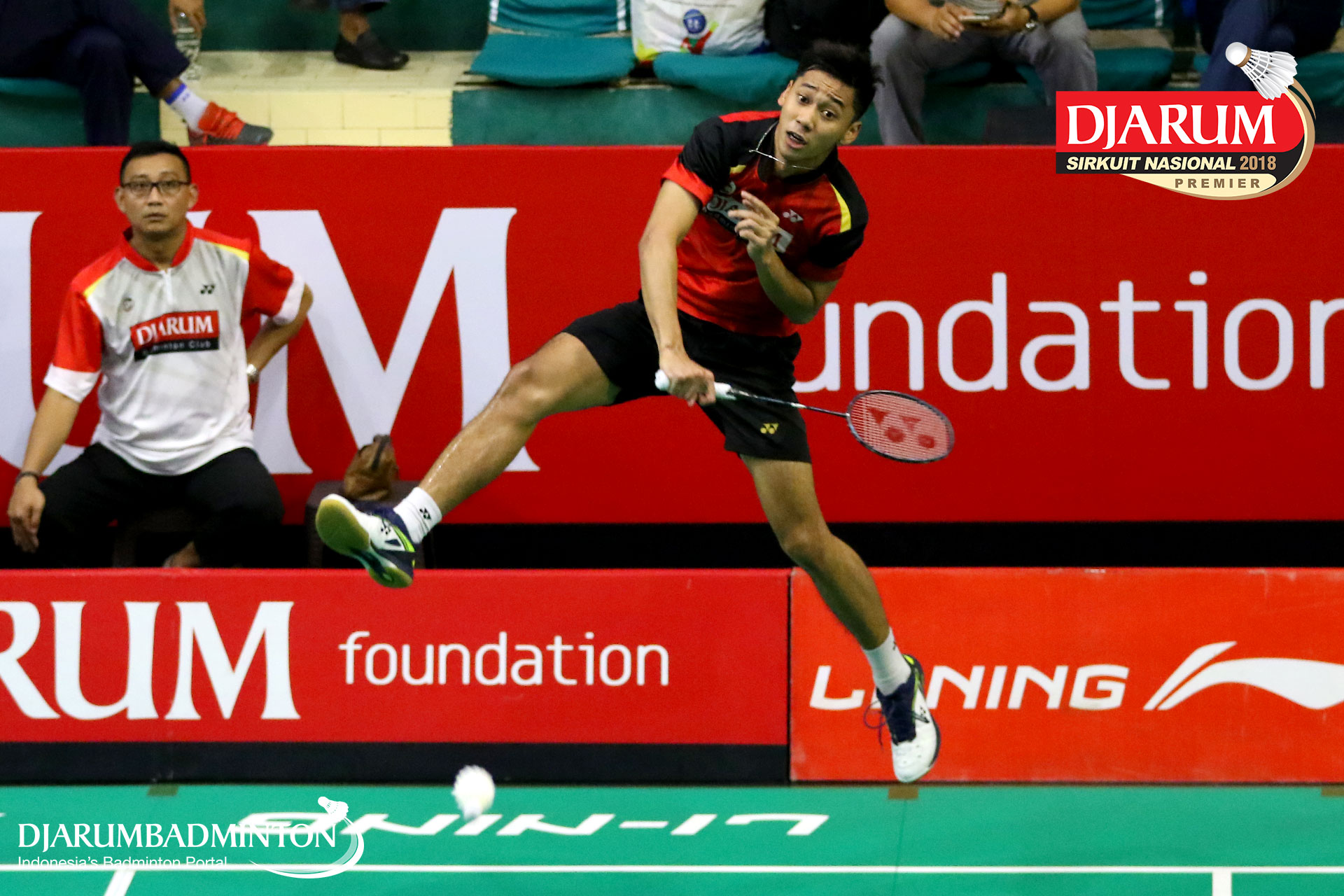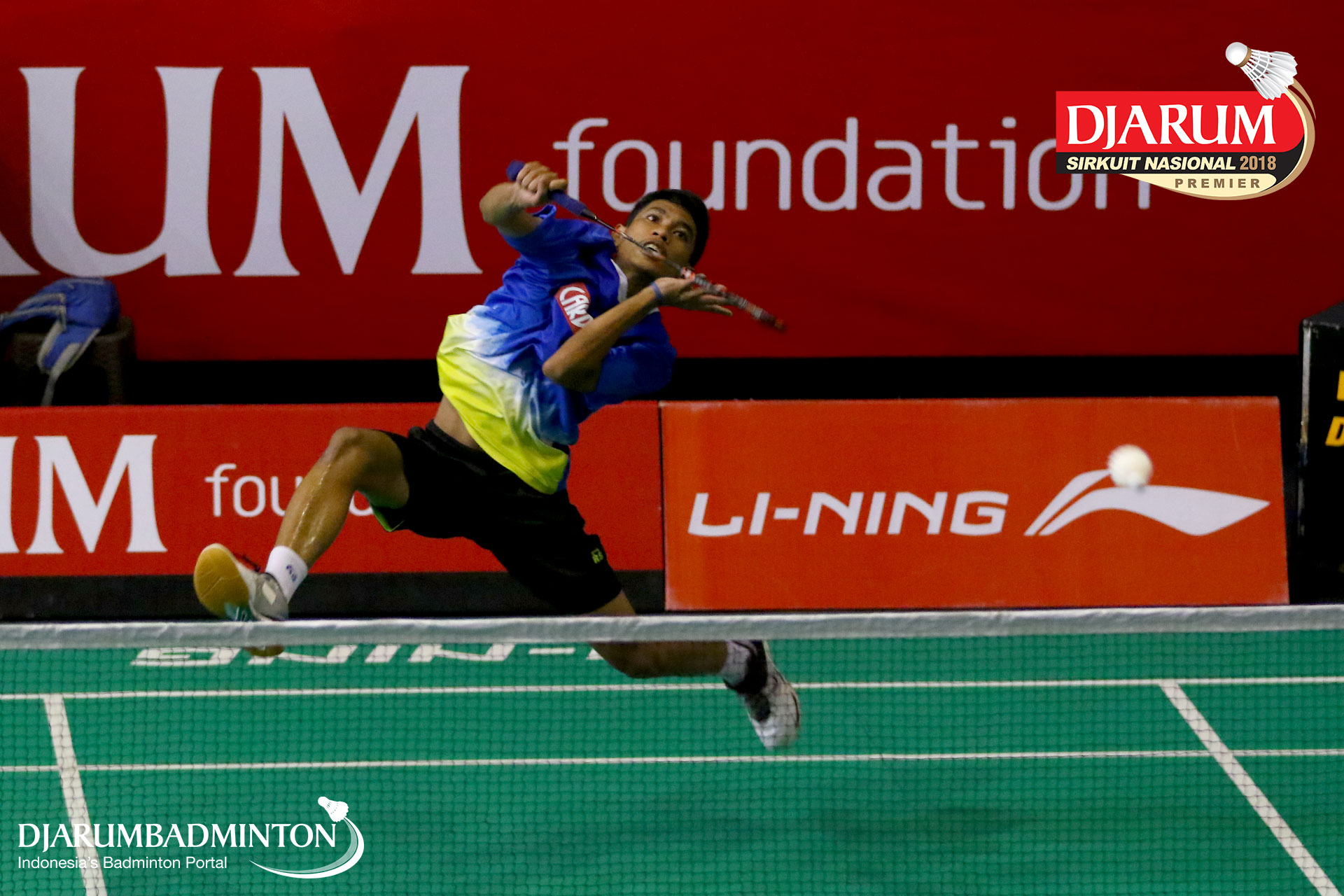Muhammad Aldo Apriyandi (PB Djarum, Kudus) melepaskan serangan