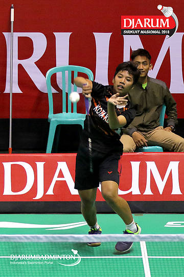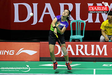 Savira Sandradewi (PB Djarum, Kudus) berusaha menyambut shuttlecock