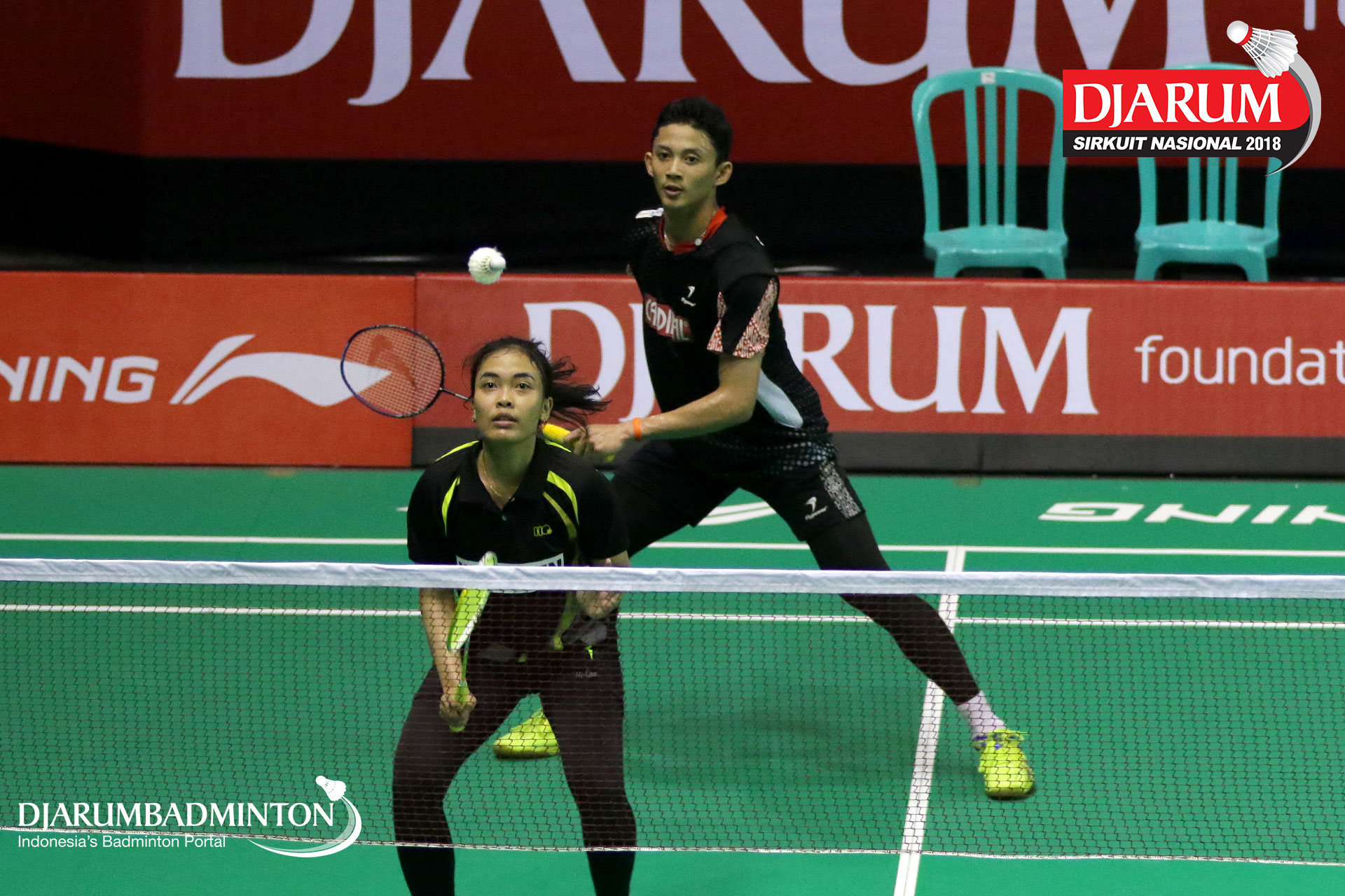 Abdul Kadir Zailani/Linda Mutiara Pertiwi (Mutiara Cardinal, Bandung+PB.SENDAWAR BADMINTON CLUB) mengembalikan shuttlecock