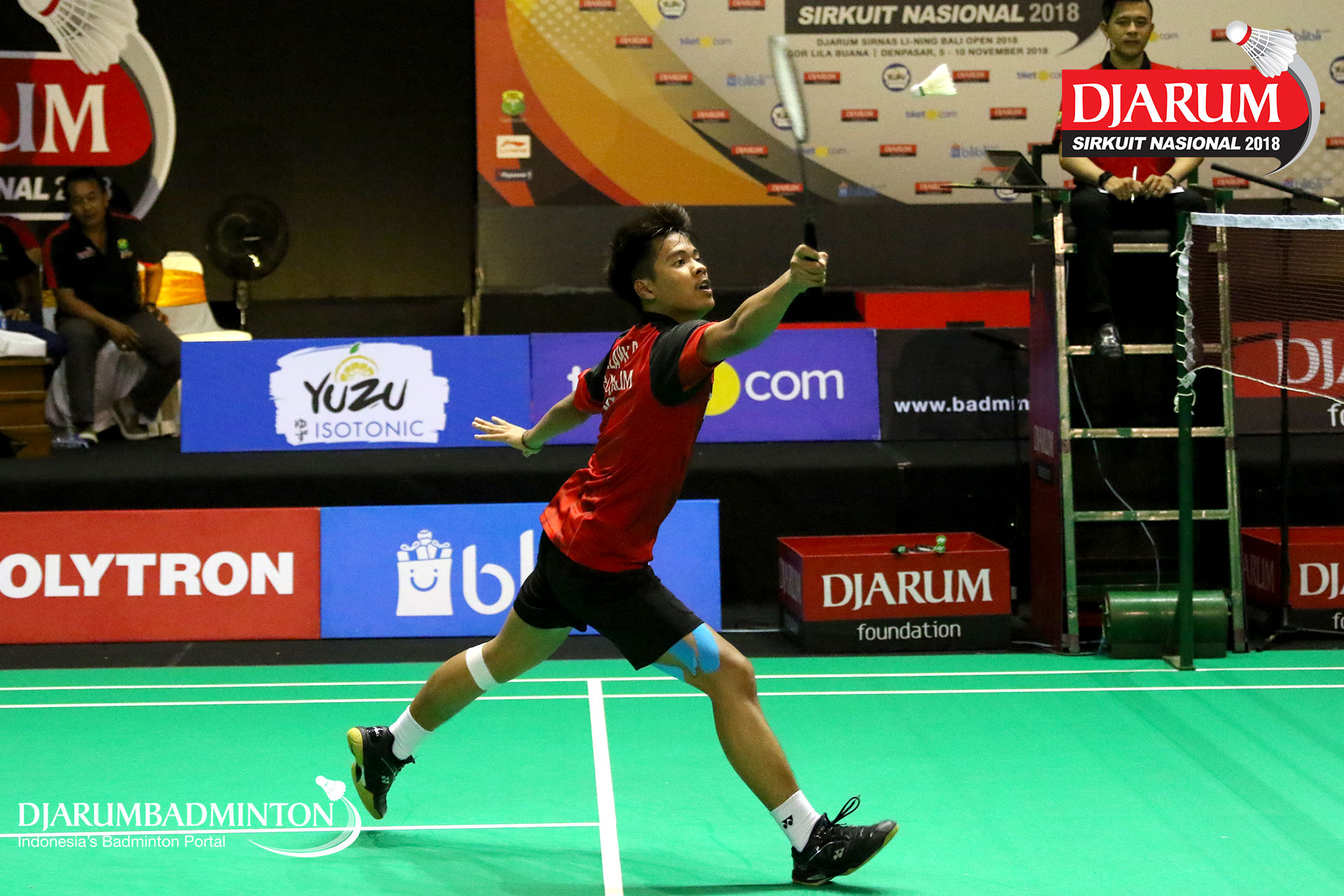 Syabda Perkasa Belawa (PB Djarum, Kudus) bersiap menyambar pengembalian
