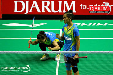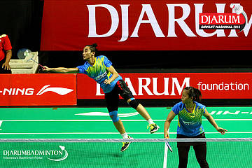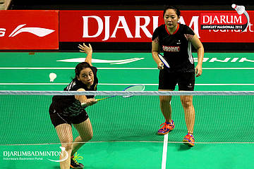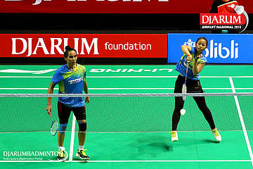 Dian Fitriani/Nadiya Melati (Pertamina Fastron, Jakut) mengembalikan shuttlecock