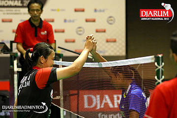 Savira Sandradewi (PB Djarum, Kudus) dan Maria Septiana Wandini Pramesti (Mutiara Cardinal, Bandung) bersalaman usai bertanding