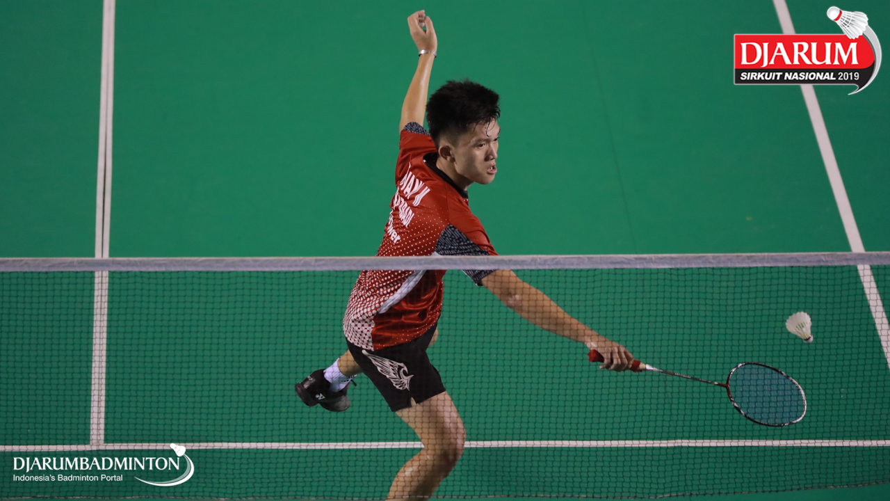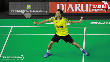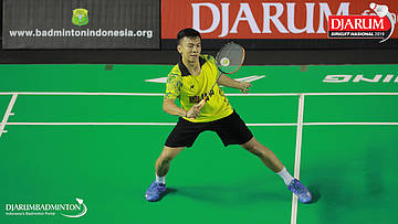 Mochamad Fajar Ardi Pradana (PB Djarum, Kudus) berusaha melakukan pertahanan