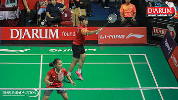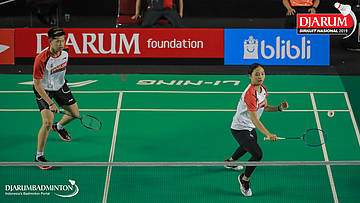 Vincentius Suwarland+Sintia Dewi Yuliani (PB Djarum, Kudus) bersiap menyambut shuttlecock
