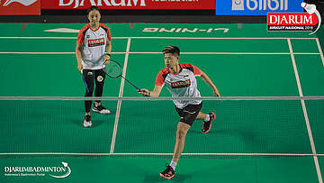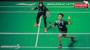 Christoffer Jonathan+Finna Juniar Nada Pramesti (Tangkas , Jaksel+Pusat Pelatihan Olahraga Pelajar) bersiap menyambut shuttlecock