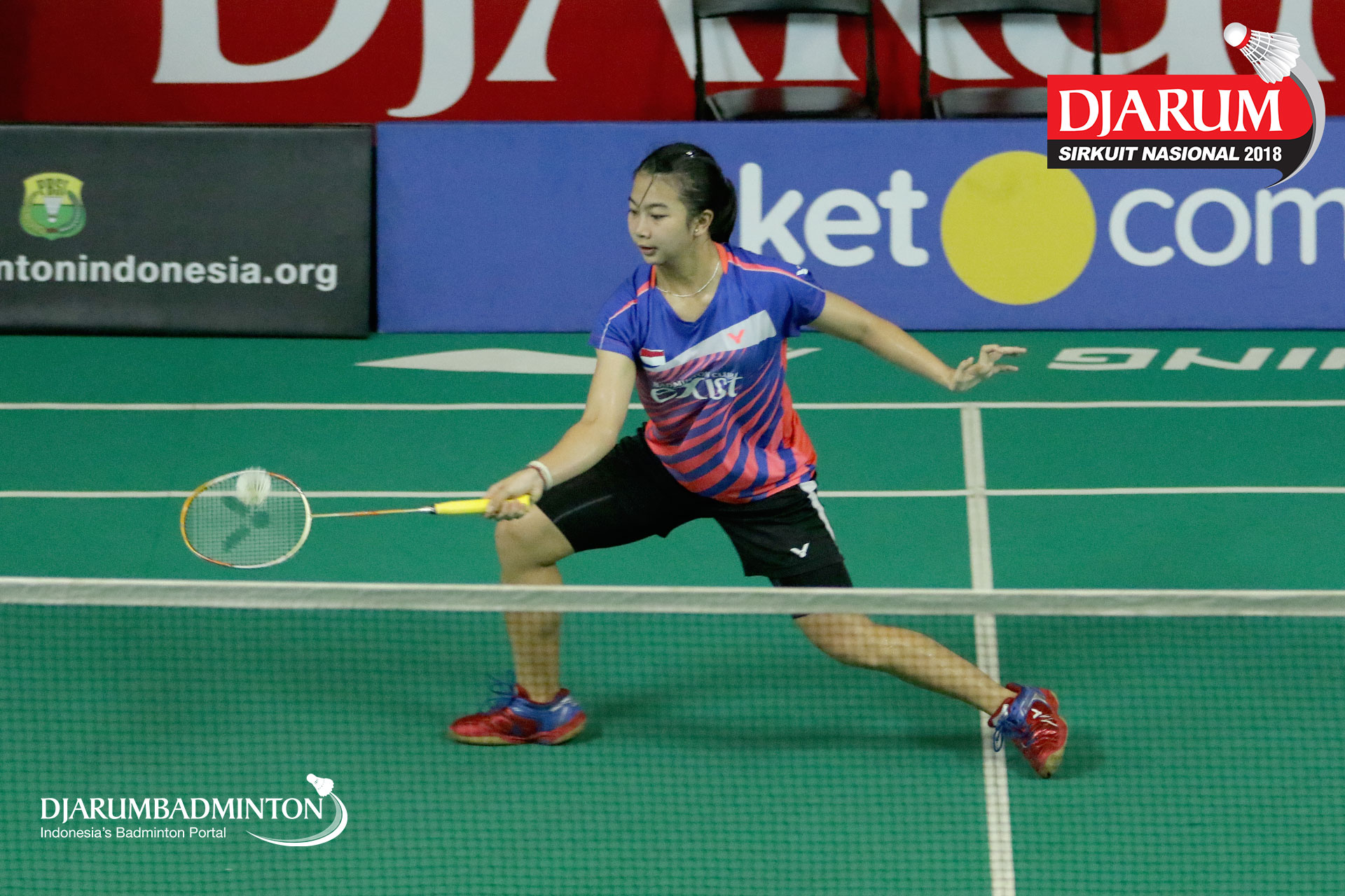 Angel Christabell Mandagi (Cahaya Bulutangkis Nusantara, Batam) bersiap mengembalikan shuttlecock