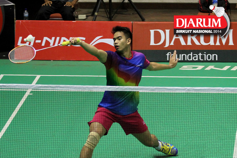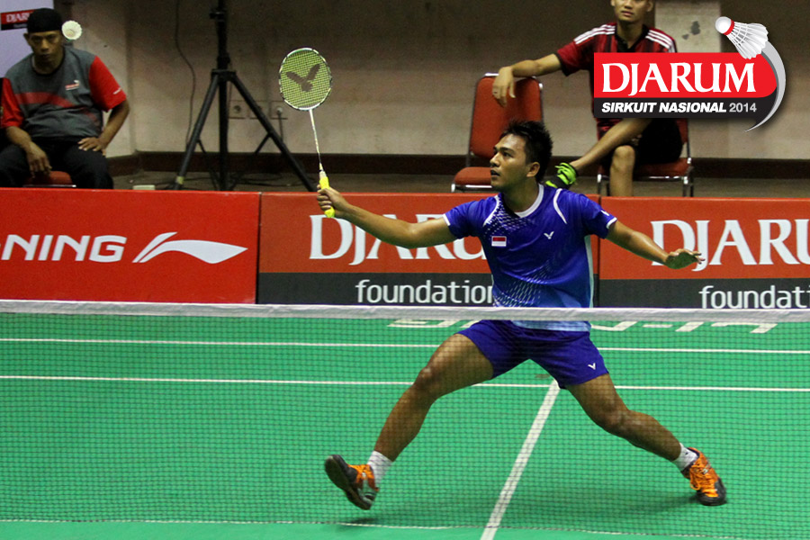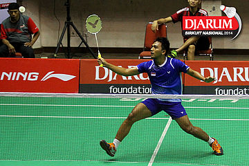 Indra Setiawan (PERTAMINA INDONESIA) mencoba menggapai shuttlecock