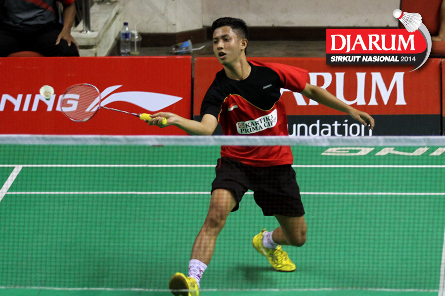 Eska Riffan Jaya (MUTIARA CARDINAL) bersiap melakukan backhand