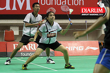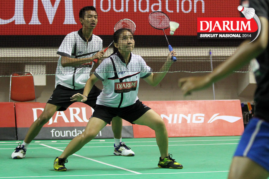 Andika Ramadiansyah/Mychelle Crhystine (DJARUM KUDUS) mengantisipasi arah datangnya shuttlecock