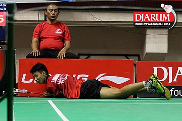 Galang Decky R (DJARUM KUDUS) terjatuh saat mencoba menggapai shuttlecock