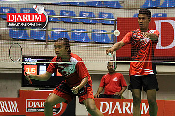 Galang Decky R/Rofahadah Supriadi P (DJARUM KUDUS) menyambar pengembalian M Aria Wijaya/Monica Nggilu (MUTIARA CARDINAL)
