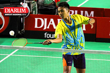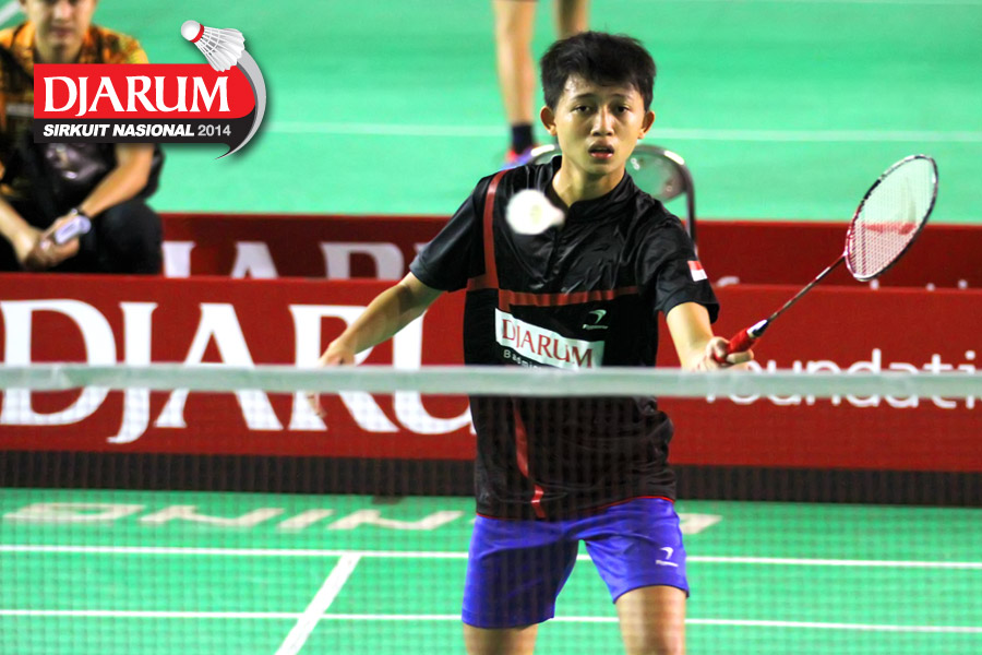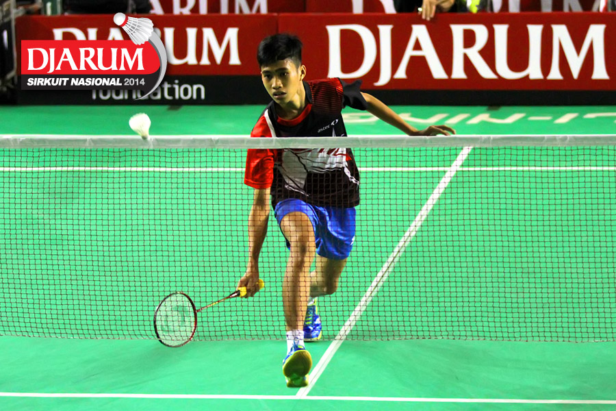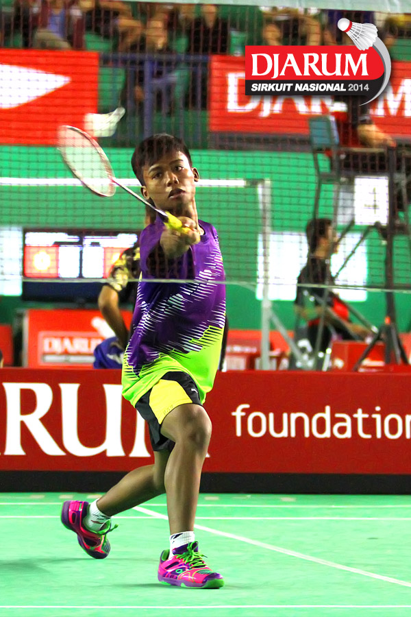 Hengky Nur Oktavian (Jaya Raya) mengembalikan shuttlecock ke arah Miftah Zulfadil (Samudera Jaya)