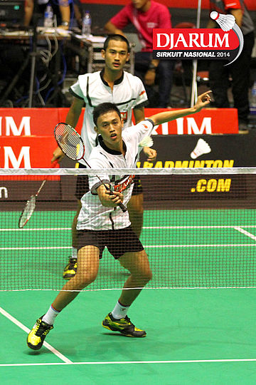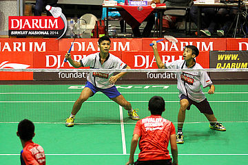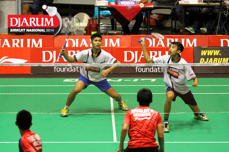 Angger Sudrajat/Tedi Supriadi (PB Djarum) bersiap menyambut pengembalian dari Akbar Bintang/Jeka Wiratama (PB Djarum).