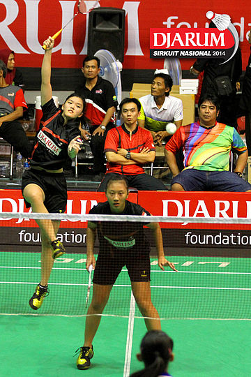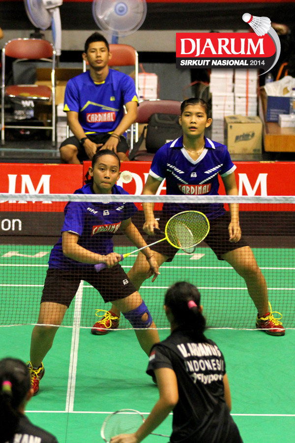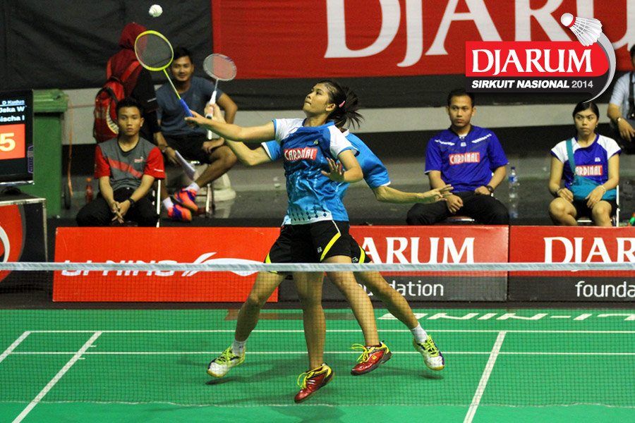 Senera Kani/Vania Arianti (PB Djarum) mengembalikan shuttlecock ke arah Dianita Saraswati/Yulfira Barkah (Mutiara Bandung).