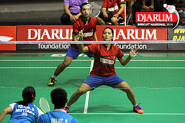 Beno Drajat/Yulfira Barkah (Mutiara Bandung) bersiap menyambut pengembalian dari Jeka Wiratama/Marsheilla Gischa (PB Djarum).