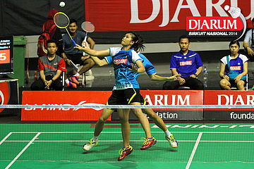 Jeka Wiratama/Marsheilla Gischa (PB Djarum) menghandang pengembalian dari Beno Drajat/Yulfira Barkah (Mutiara Bandung).