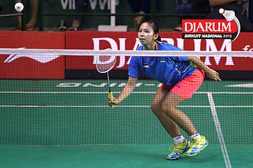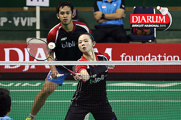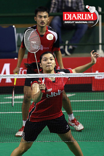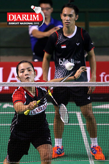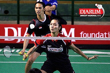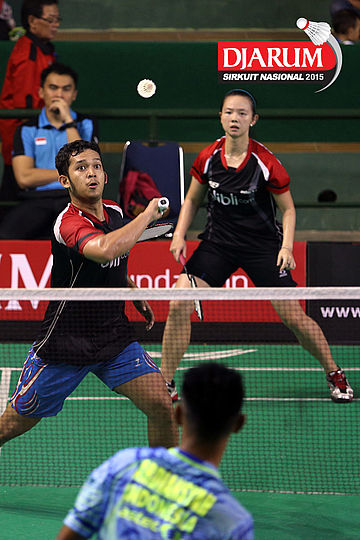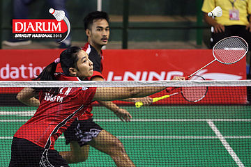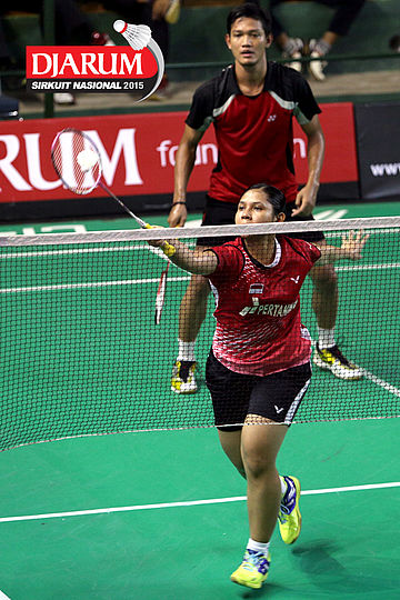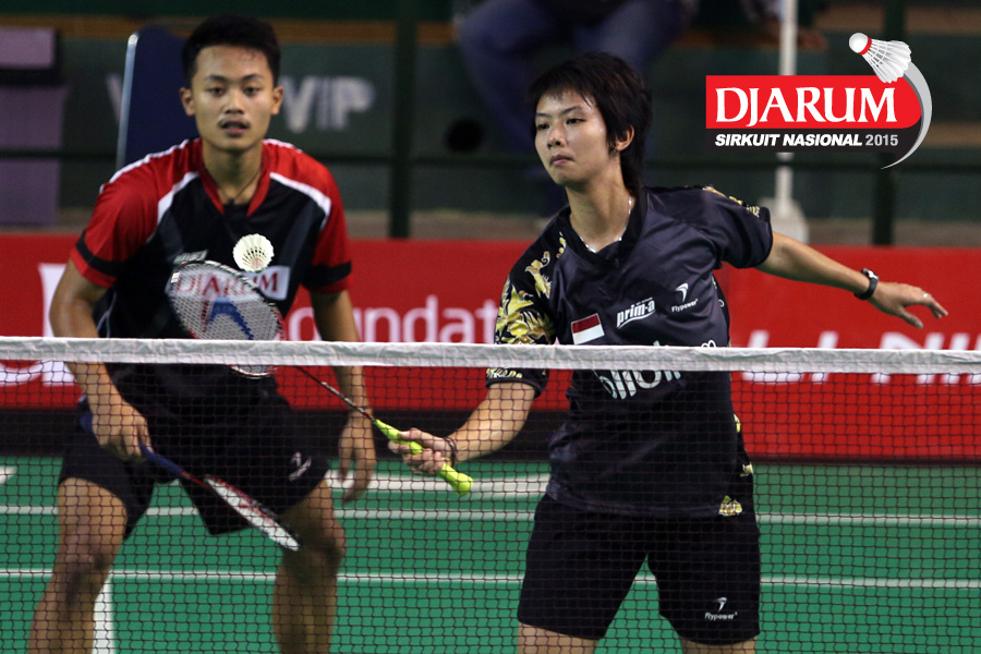 Angger Sudrajad/Ristya Ayu (Djarum Kudus) bersiap menyambar pengembalian.