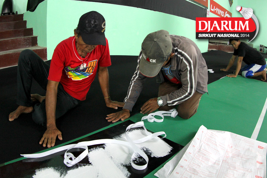 Seorang pekerja saat membuat garis pembatas lapangan dan karpet menggunakan benang
