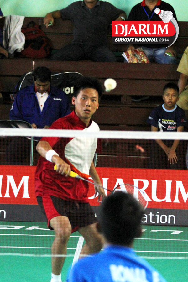 Christoven Howard (Candra Wijaya) mengembalikan shuttlecock ke arah Ronal Fajrin (IPC Jakarta)